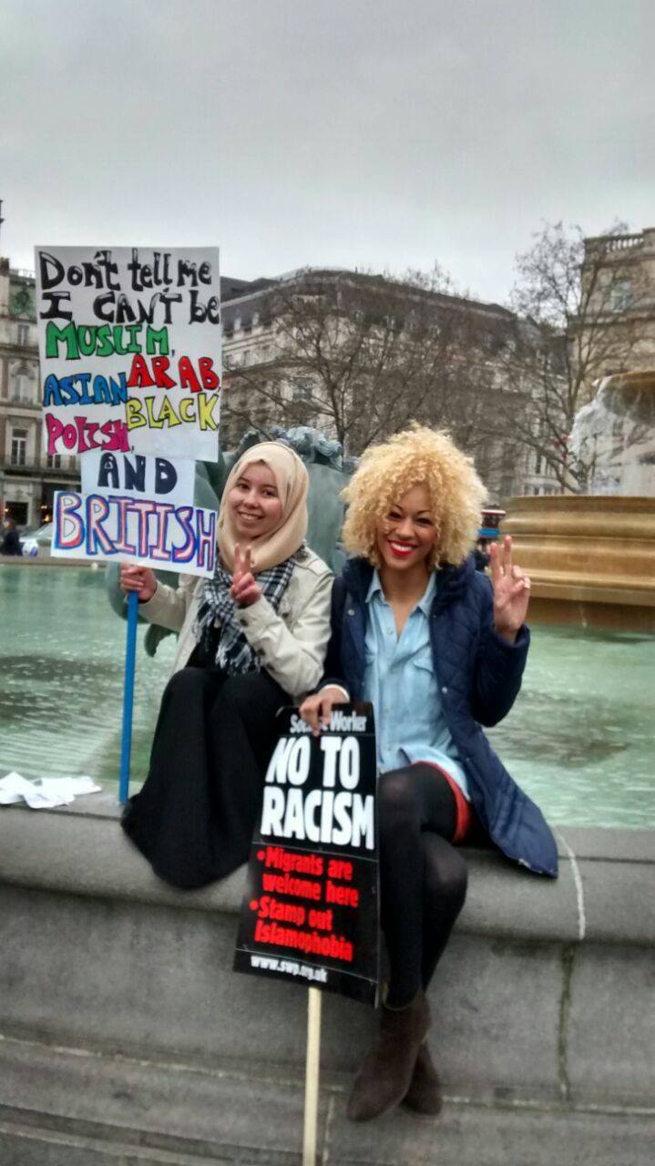 On Saturday 21st March, UN Anti-Racism Day, I saw journalist Owen Jones tweet that there’d be a march “against racism, anti-Semitism and Islamophobia” that afternoon in London, organised by Stand Up To Racism. The date signifies the anniversary of the 1960 Sharpeville Massacre in South Africa. It was to be my first march – not my proudest admission. I’d never gotten myself organised and I barely made this one, only spotting the tweet an hour before it started. On the train I felt energised; I had a purpose. I was to be involved in what I completely believed in. A bizarre shyness and uncertainty flooded in though, the moment I emerged from Oxford Circus tube station into the masses of people. I doubted I was up to the task, whether I was loud and strong enough. I accepted a Socialist Worker placard that read ‘NO TO RACISM’, with ‘Migrants are welcome’ and ’No to Islamophobia’ underneath as bullet points. Holding it, I was verified as a protester, associated with resilience and resolutions yet I felt the opposite, perhaps remembering that reduction of myself as an “f*cking black” something. I walked up Regent Street to the assembly point at Portland Place and in record time made a new friend, Meriel. We stood waiting for the march to begin, making our observations to one another. The atmosphere was infectiously jolly, raucous even. There was a shifty moment when the megaphone leaders started chants that everyone else seemed to know, but the lyrics weren’t tricky. “We are Black, White, Asian and we’re Jews (and we’re gay!)”, to the tune of “She’ll Be Comin’ Round The Mountain”, quickly became my favourite. It really sticks in your head.